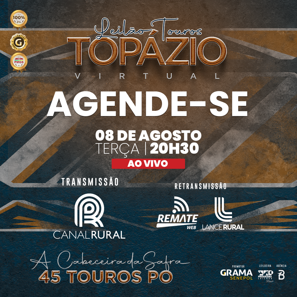 Então programe-se para investir! Leilão Touros Topázio, dia 8 de agosto, e Leilão Celebration Grama Senepol, dia 22 de agosto, pelas lentes do Canal Rural, a partir das 20h30, com retrasmissão pelos canais Remate Web e Lance Rural.