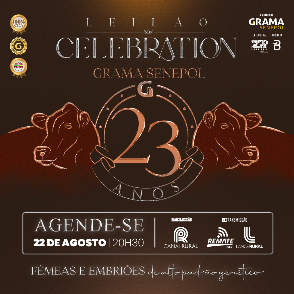 E para quem acabou perdendo tal oportunidade, ainda pode aproveitar o próximo leilão Grama Senepol que acontecerá no dia 22 de agosto, a partir das 20h30, pelo Canal Rural, com retransmissão pela Remate Web e Lance Rural. O Leilão Celebration ofertará fêmeas e embriões de altíssimo padrão genético. Não perca essa oportunidade!