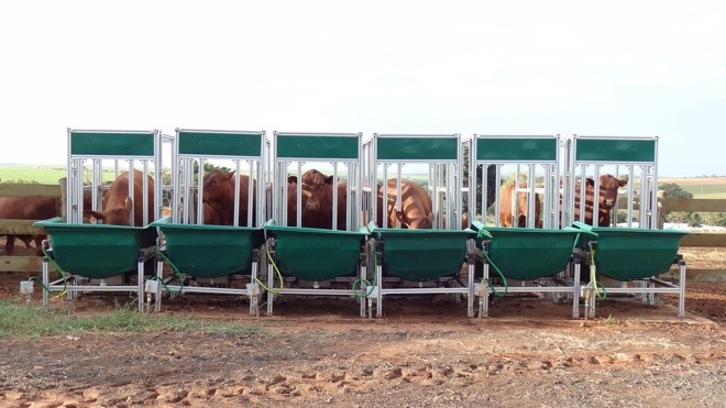 Nesse novo cocho eletrônico de água sensores identificam a novilha que passa com o seu chip pela janela que dá acesso à água. O cocho é uma balança e o consumo é informado com o peso que fica de água após a saída do animal. A água é reposta no cocho eletronicamente.