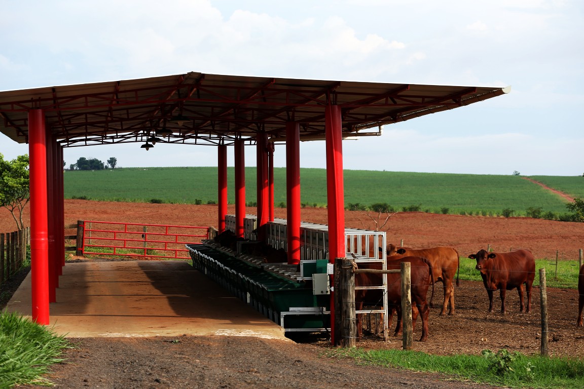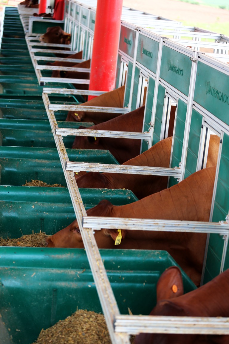 O cocho de água tem sensores que funcionam como balança e informam o peso da água toda vez que um animal entra e sai com a cabeça por uma janela com sensor que identifica pelo chip no tag aplicado a cada uma. À medida que a novilha se afasta do cocho, com o nível de água mais baixo, outro sensor aciona a reposição automática da água. Essa é a diferença do que já existe no teste para medição da eficiência alimentar – um vagão repõe a comida cinco vezes ao dia.